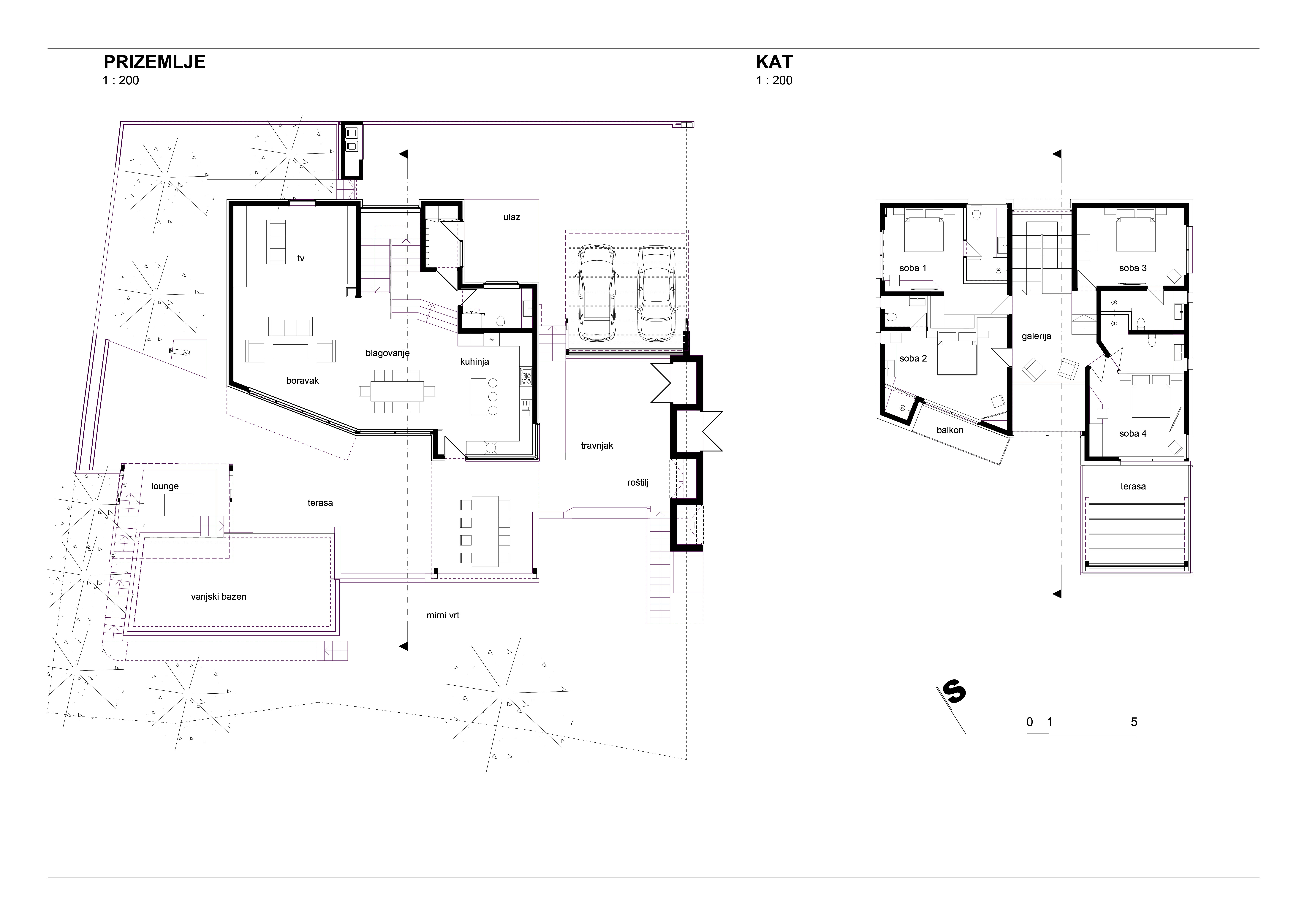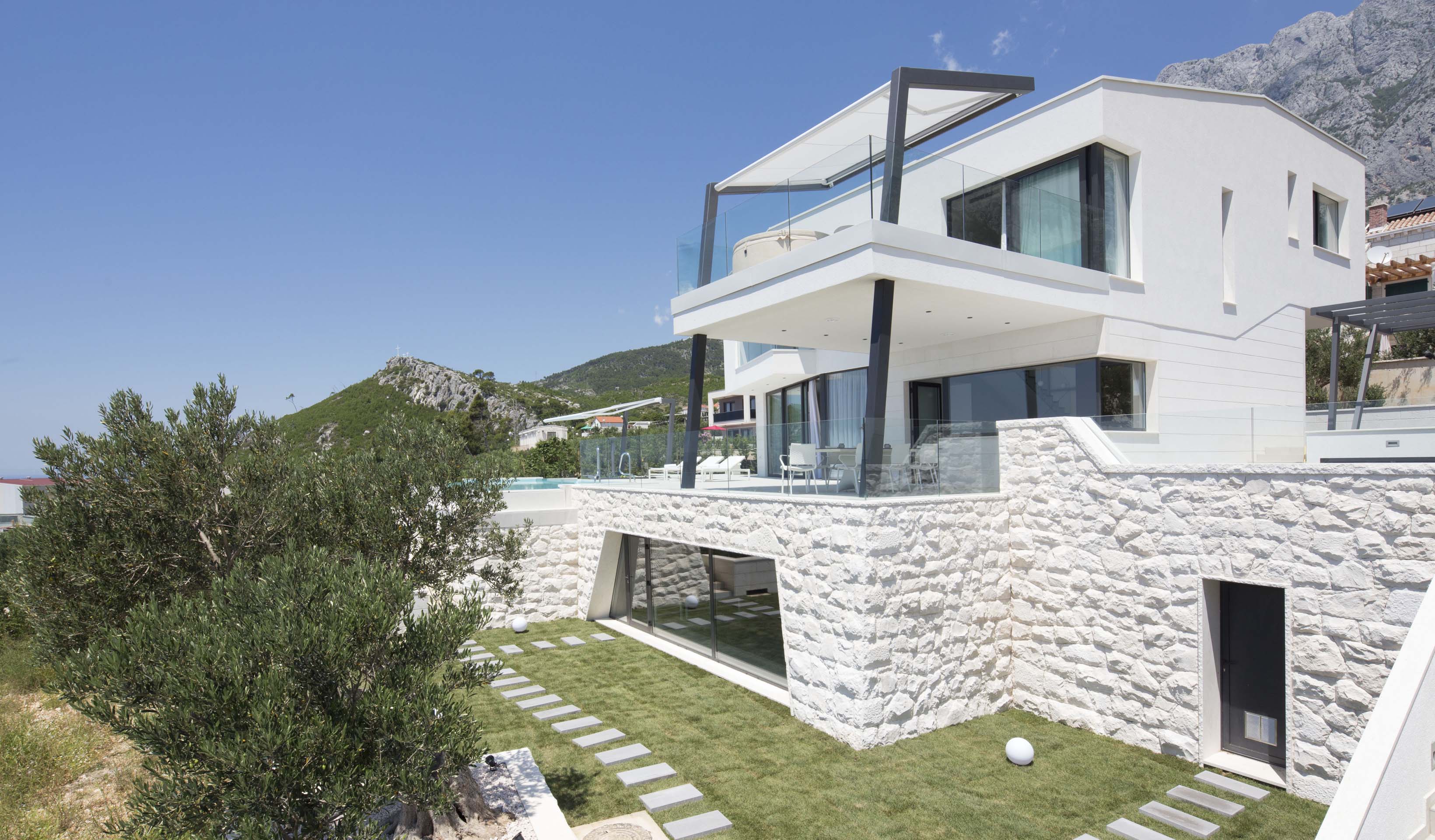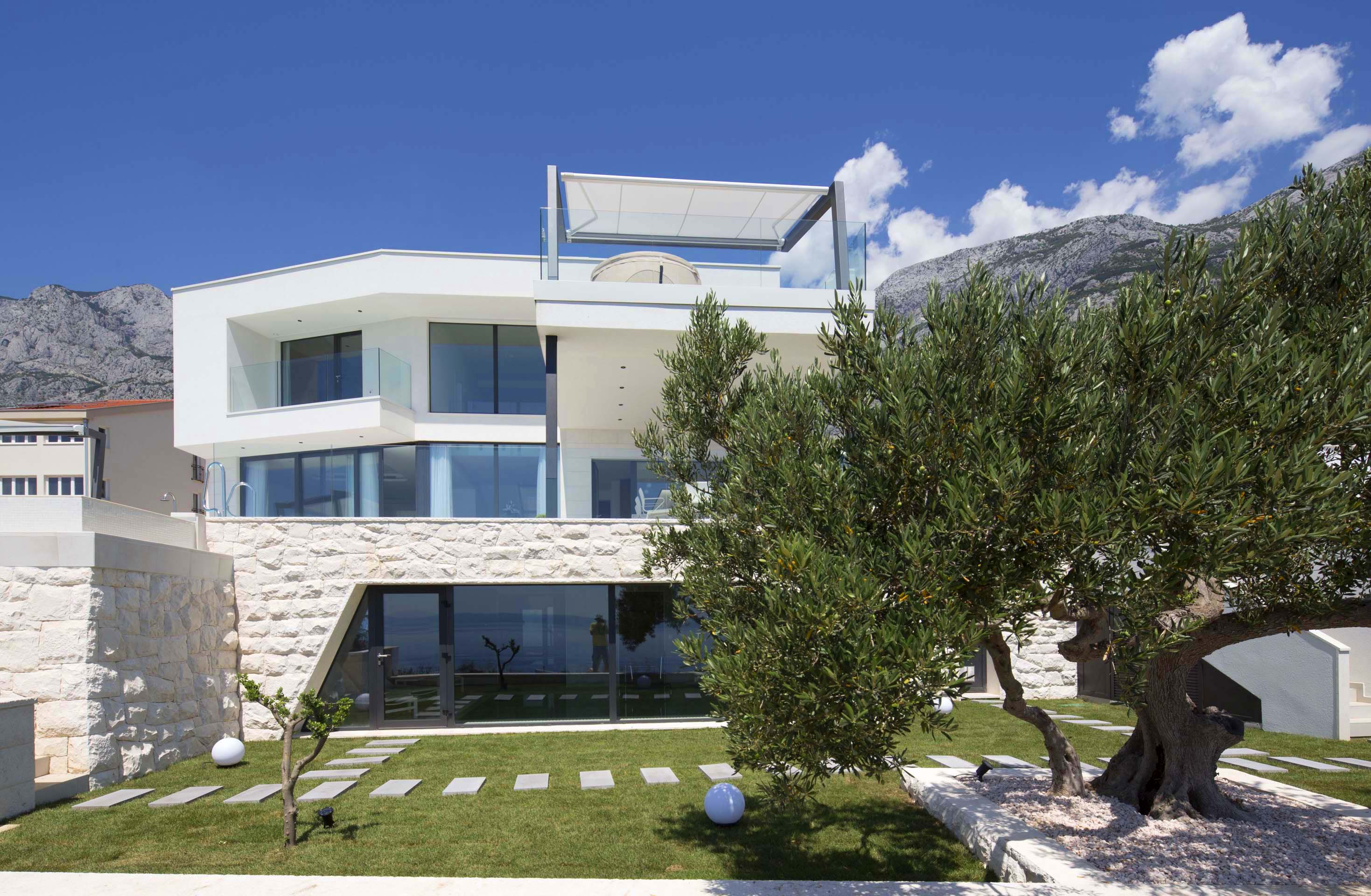 Oblikovanje vanjskih prostora parcele, raspoređenih na tri visinske razine pristupne zone ulaza i parkinga, glavne dnevne zone i mirne zone ispred suterena. Oblikovanje karakterizira maksimalno vračanje stabala masline inicijalno zatečenih na lokaciji, kao dio inspiracije i nositelja identiteta. Funkcionalno oblikovanje predviđa dupliranje namjena unutarnjih funkcija u vanjske i njihovu skladnu artikulaciju i međusobnu integraciju : boravak, kupanje i tuširanje, blagovanje, priprema hrane, igra, odmor…