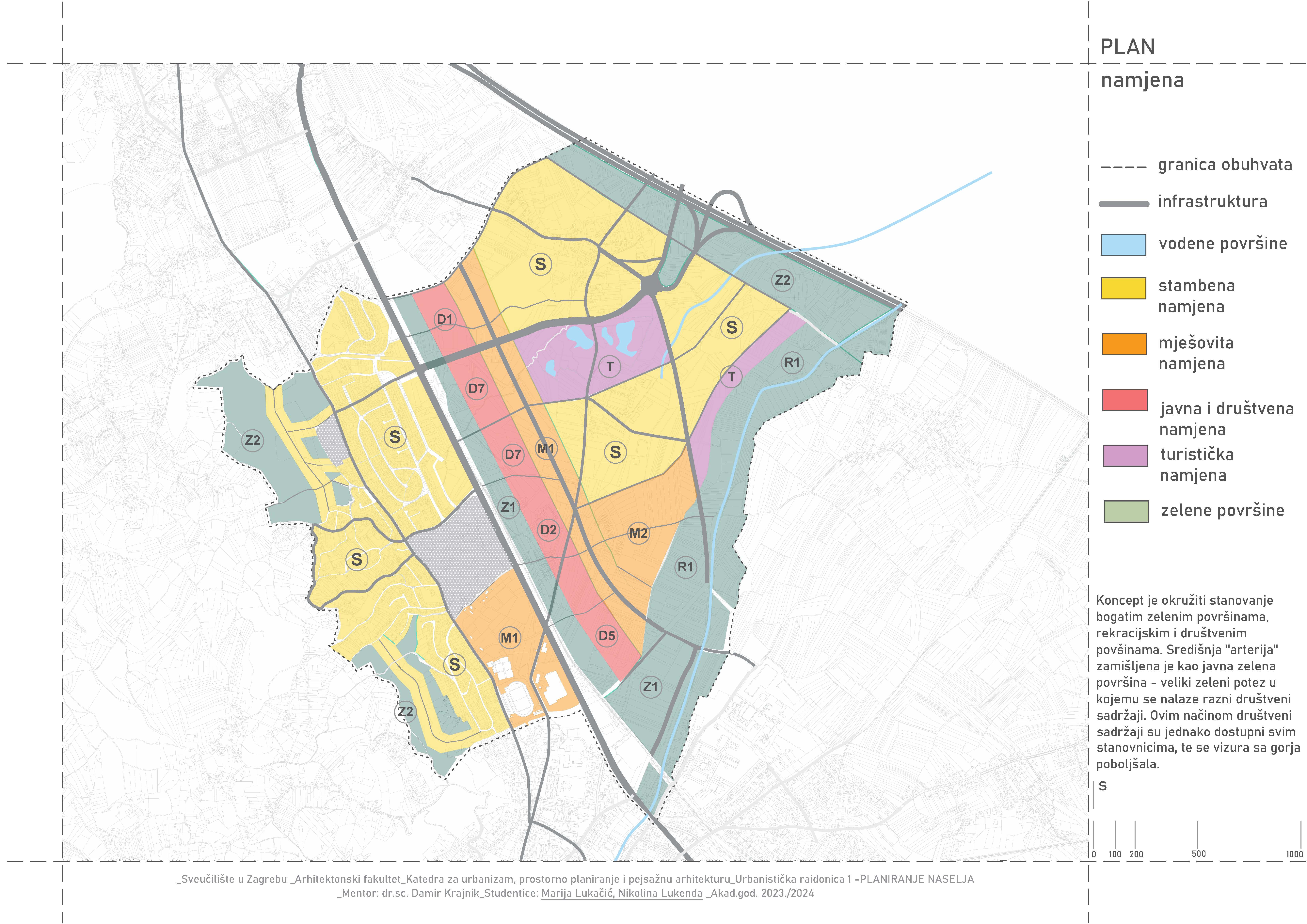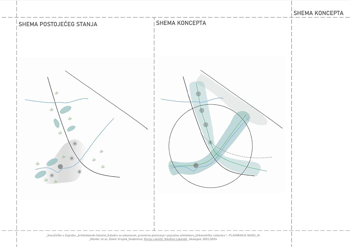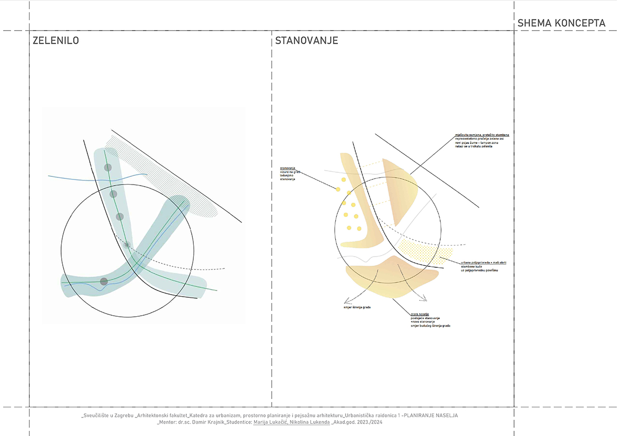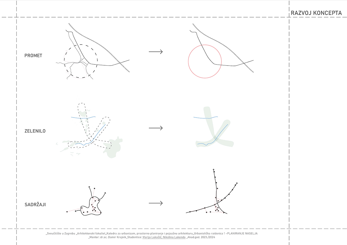 Rad je započet nakon pomnih analiza postojećeg i planiranog stanja Grada Samobora. Nakon analiza glavni zaključak bio je da su zelene površine raštrkane po naselju, stanovanje je centralizirano u centru grada, glavne prometnice prolaze i ometaju glavne sadržaje. Također smo primijetili I potencijal Žumberačkog Gorja. Prostorni koncept razvoja grada zamišljena je promatranjem ulaza u grad s autoceste te ulaza Bobovica. Ovaj potez je prepoznat kao potencijal jer nudi različite doživljaje prilikom ulaza u grad, a dodatnim spajanjem rahlih zelenih poteza omogućili smo zaštitu zonama stanovanja. Potez park šume uz autocestu je zaštitni sloj koji omogućuje kvalitetnije stanovanje. Glavni zeleni potez sjever-jug postaje kulturni zeleni potez, u kojem se nalaze zaštićeni parkovi i razni javni sadržaji društvenih i kulturnih namjena. Ovaj glavni potez omogućuje svim stanovnicima jednaku dostupnost sadržaja. Također, sa zapadne strane samoborskog područja protežu se kvalitetnije vizure na središte grada. Treći zeleni potez koji prati potok, postaje sportsko-rekreacijska zona sa turističkim sadržajima. Osim povećane kvaliteta ulaza s autoceste, povećana je i kvaliteta ulaza putem željezničke trase u grad. Određene zone, poput područja Šmidihena odlučili smo zadržati u središnjem zelenom potezu. Prometna mreža grada se povećala već i s dodatkom željezničke trase, ali i dodavanjem obilaznice kako bi se rasteretio centar Samobora. Na taj način smanjuje se intenzitet prometa unutar centralnog povijesnog dijela grada, te omogućava bržu prolaznost. Na zapadnom djelu, u gorju, predviđamo gradnju samostojećih obiteljskih kuća - ladanjske kuće, obiteljska gospodarstva... kako bi sačuvali i povećali kvalitetu života u šumskom području. Ovim rješenjem potičemo naseljavanje u